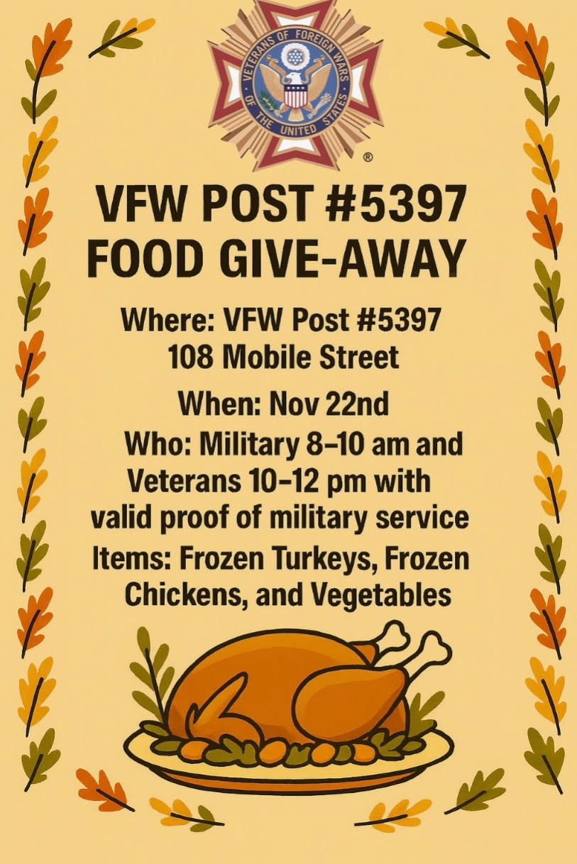 VFW Post #5397 is hosting a Food Give-Away on Saturday, Nov 22nd, featuring Frozen Turkeys, Frozen Chickens, and fresh Vegetables. We want to support our military families and veterans this holiday season!